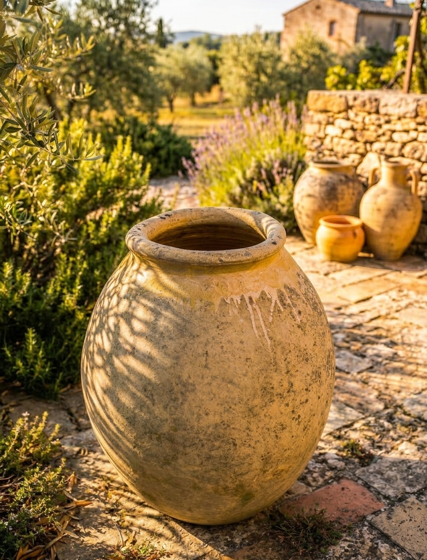 Sa forme en « ovoïde inversé » présente des courbes d’une harmonie parfaite. Les proportions équilibrées confèrent à la jarre une présence sculpturale imposante. La patine naturelle souligne délicatement le passage des siècles. En outre, le contraste entre la terre brute et le col vernissé crée un jeu de textures fascinant. Cette jarre ne se contente pas de décorer, elle raconte une véritable épopée méditerranéenne. Son élégance intemporelle s’adapte aussi bien aux intérieurs classiques qu’aux jardins contemporains. C’est une invitation au voyage dans la Provence du Grand Siècle.