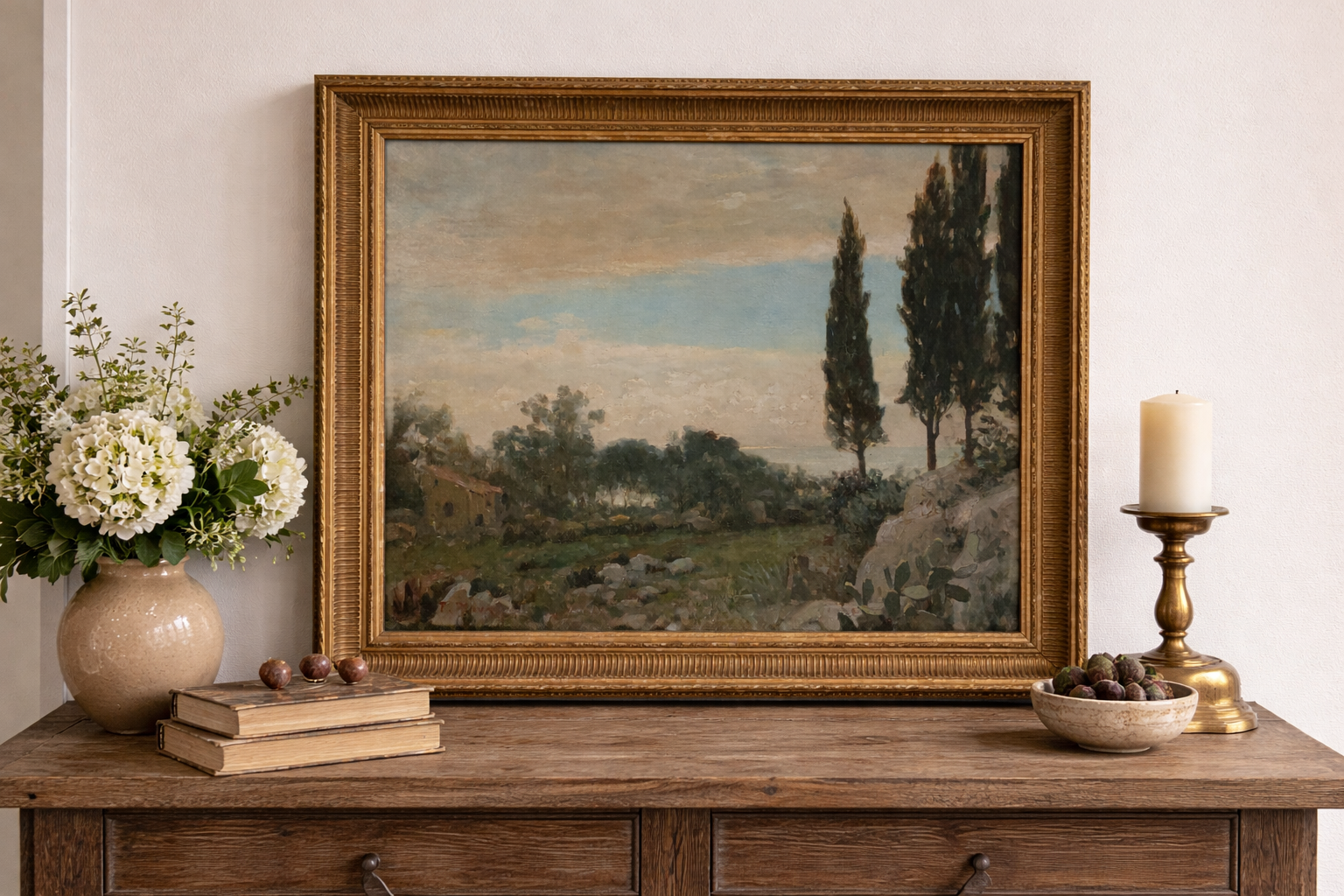 Plongez au cœur d’une Provence éternelle avec cette huile sur toile de François Alaux. En effet, ce maître bordelais capture ici l’essence lumineuse du Sud. Le spectateur contemple une vue dégagée vers l’horizon marin. Par ailleurs, les cyprès majestueux structurent la composition avec élégance. Ce tableau incarne ainsi la douceur de vivre méditerranéenne. De plus, le ciel vaporeux souligne la profondeur de cette œuvre d’art authentique.